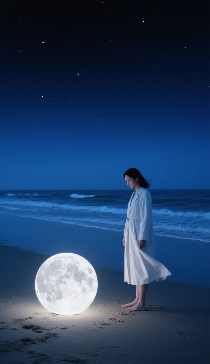 A barefoot figure wearing a white long windbreaker stands alone on a peaceful beach, looking down at the glowing 'artificial moon' on the beach. The background is a blue sky and waves at night, and the main colors of the picture are deep blue and moon white. The composition is simple with a large amount of white space, creating a poetic, lonely, and dreamy atmosphere. The style blends photography poetics with surrealist visual language, creating a modern fable like sense of tranquility. The ratio is 9:16