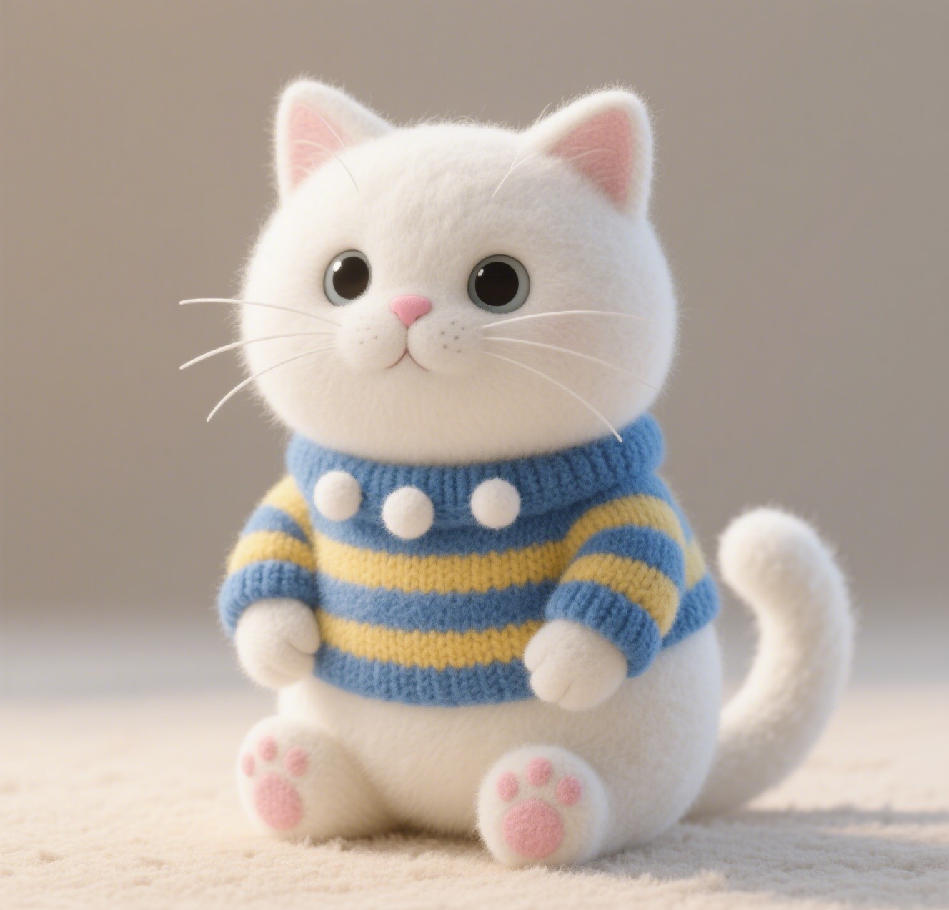 The image style is '3D rendering' felt art, featuring a cute cat, blue beige clothes, and ultra-high definition picture quality