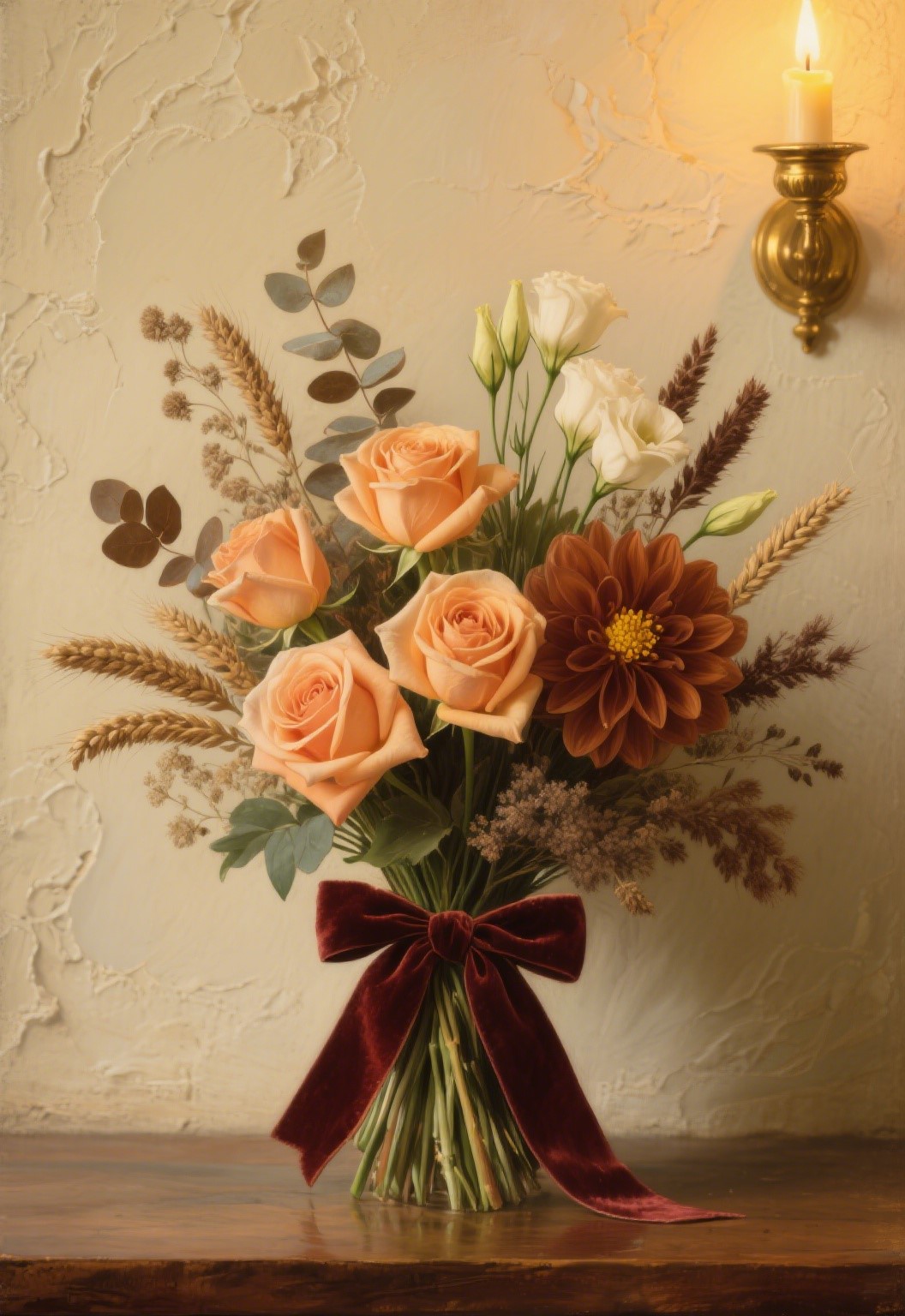 Vintage style hand-held flowers, warm colored flowers paired with dried flowers, exude a classical charm. Classic and romantic elements coexist at weddings, with textured walls as the main background and warm candlelight as the backdrop, in a ratio of 2:3