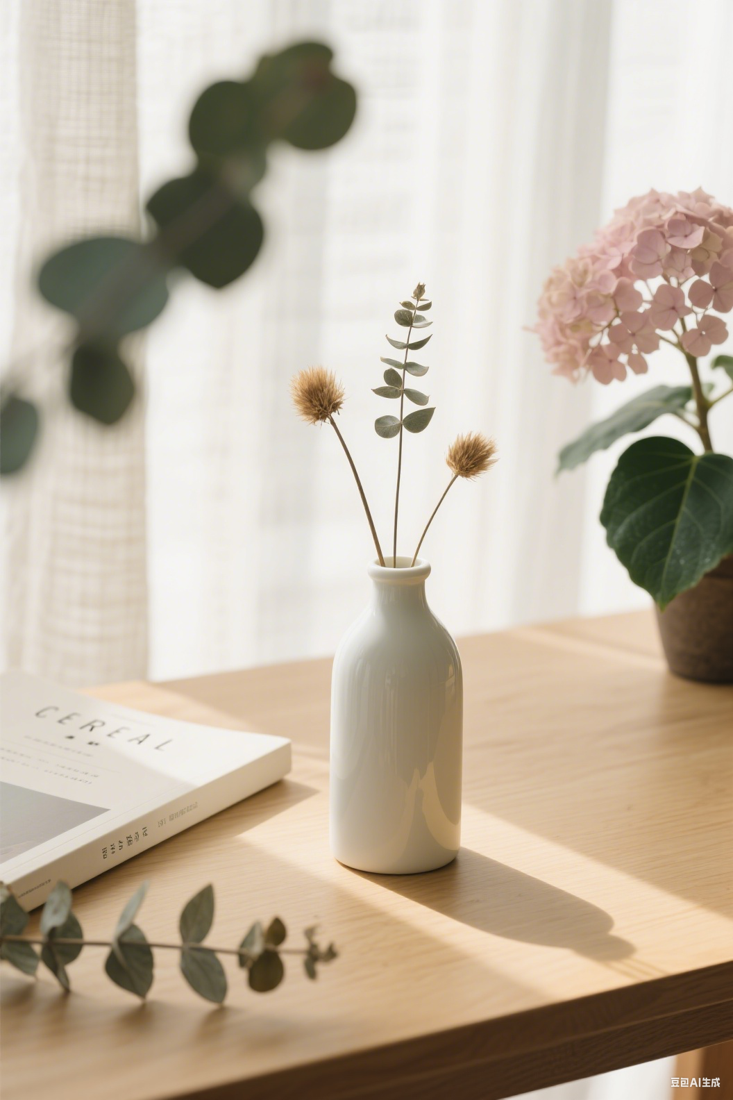The white bottle next to the magazine on the table has a simple and pure design, with a warm winter style. The surrounding plants and foreground plants fade, and the contrasting light is eye-catching. The scene style is full of light, full of brightness, tranquility, Japanese photography, sun drying masters, and formalist aesthetics, with a ratio of '2:3'