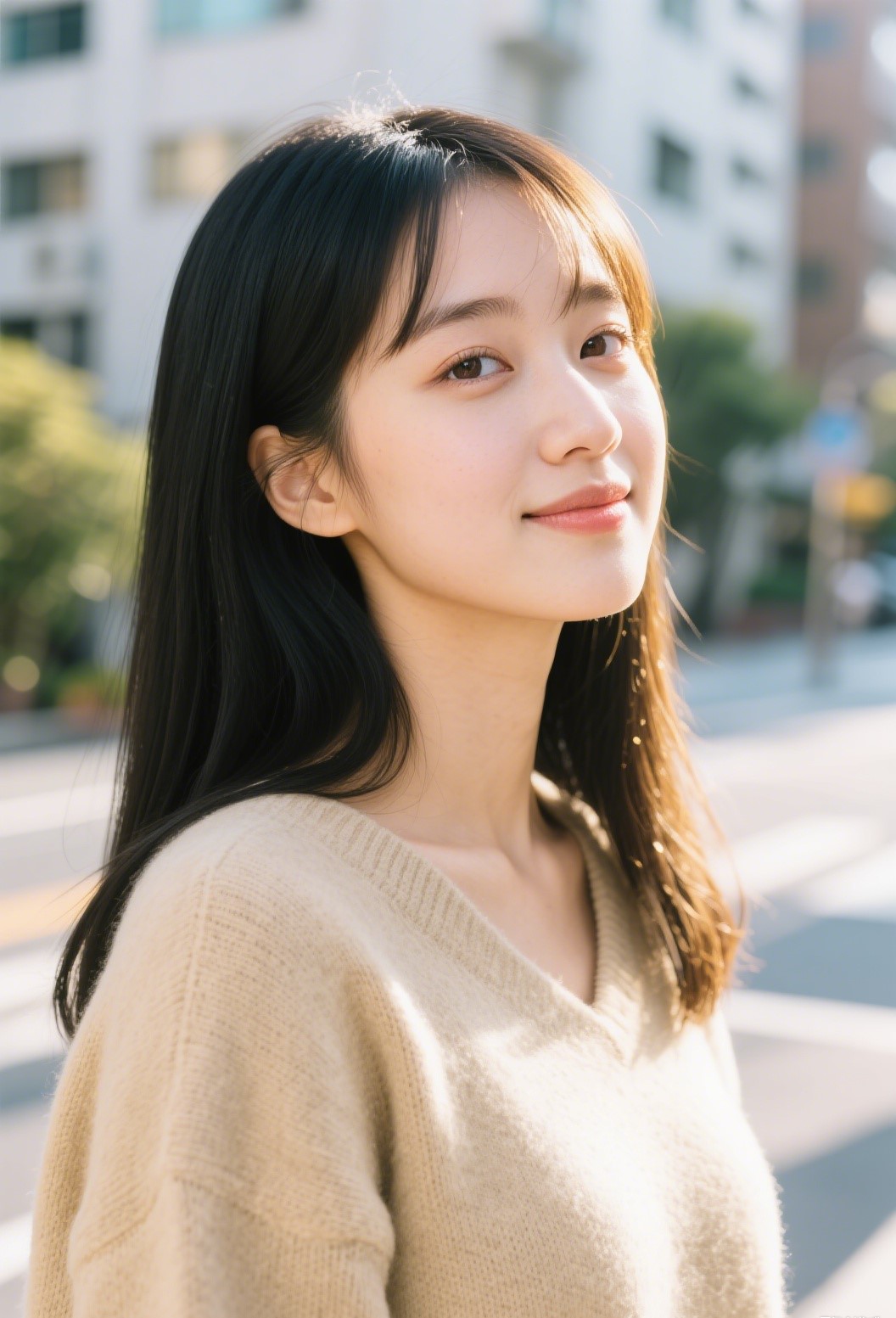 Portrait photography style, girl next door, daytime urban street scene background, close-up of face, turning head, Canon film color series, khaki sweater, shawl long hair, sunlight shining on the left side of the hair with delicate and realistic light, ratio of 2:3