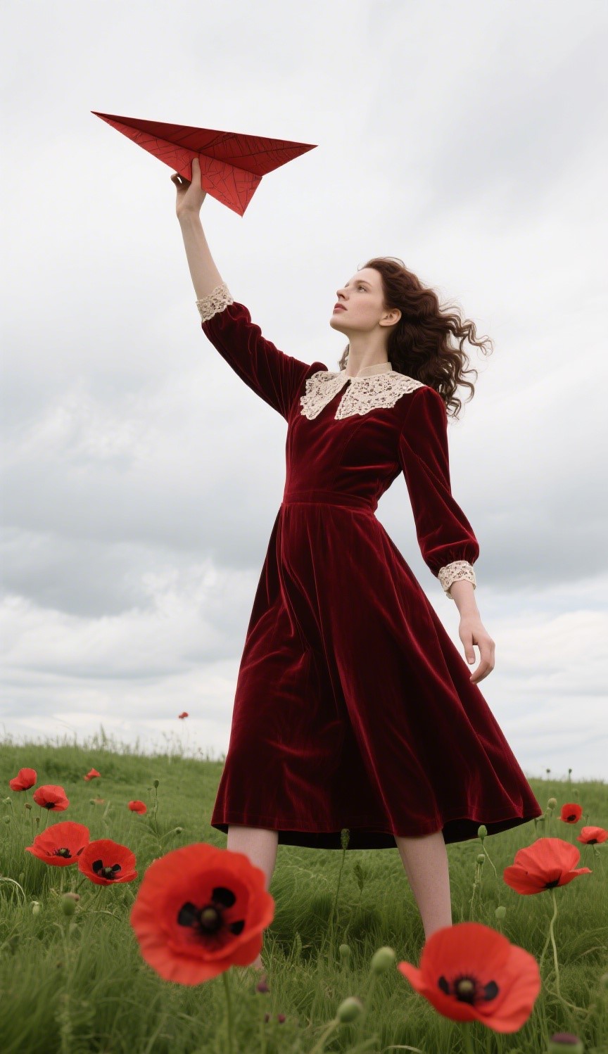 A woman wearing a deep red retro dress stands on a green field grass, holding up a huge red paper airplane. The grass is adorned with red poppies, and the background is a gray and white cloudy sky. The composition is highly dynamic and symbolic, with a fusion of conceptual fashion and visual poetry. The color contrast is strong, expressing themes of flight, dreams, and freedom, and has a surreal and cinematic texture. The ratio is 9:16