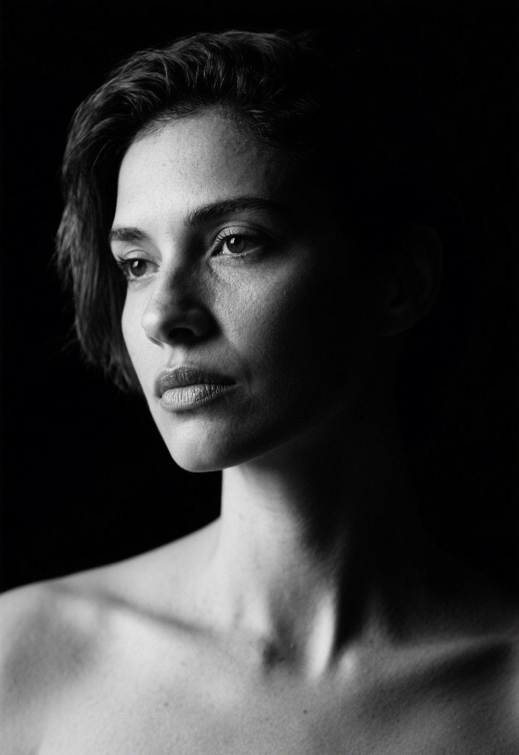 The style of 'portrait photography' is a black and white portrait of a woman, subtly using light and shadow. It was taken by photographer Rogerio Reis using a Leica M11 for close-up photography at a scale of '2:3'