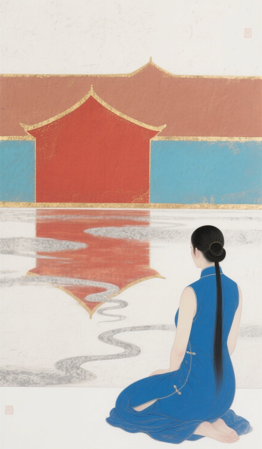Can you help me generate a picture: Rock Color Plate Painting, Luo Yang, Mark Roscoe, Turner, a quiet figure with contrasting colors, architectural reflection, Oriental beauty, minimalism, white space, artistic conception, color curves, ancient charm with white space, scale '9:16'
