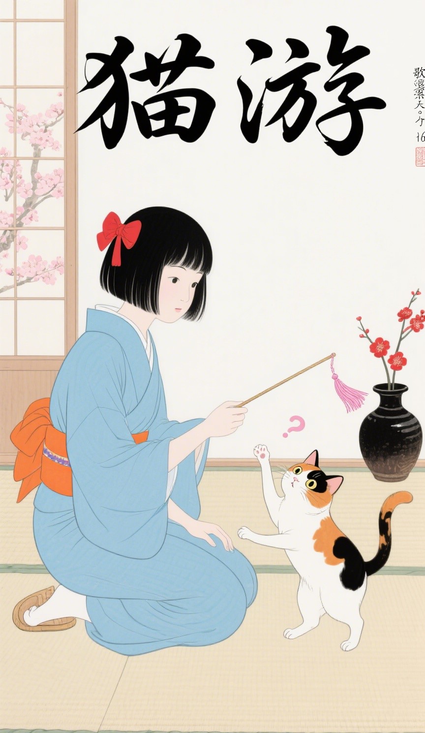 The image style is ukiyo-e illustration, poster, a girl and a cat playing a game, with a scale of 9:16