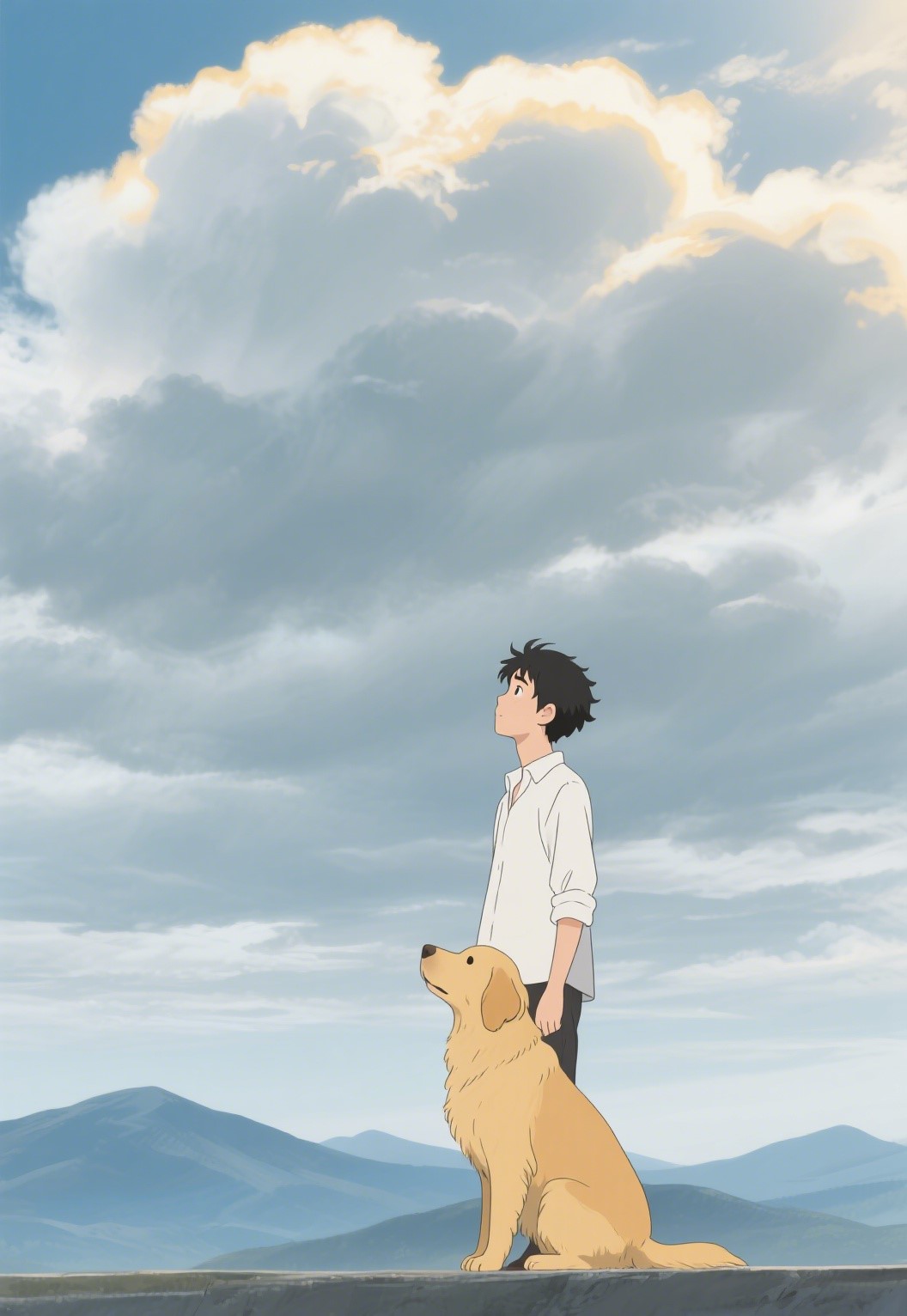 Anime style, a man in a white shirt and a dog looking at the clouds, ultra wide angle, shot from a distance, with a ratio of 2:3