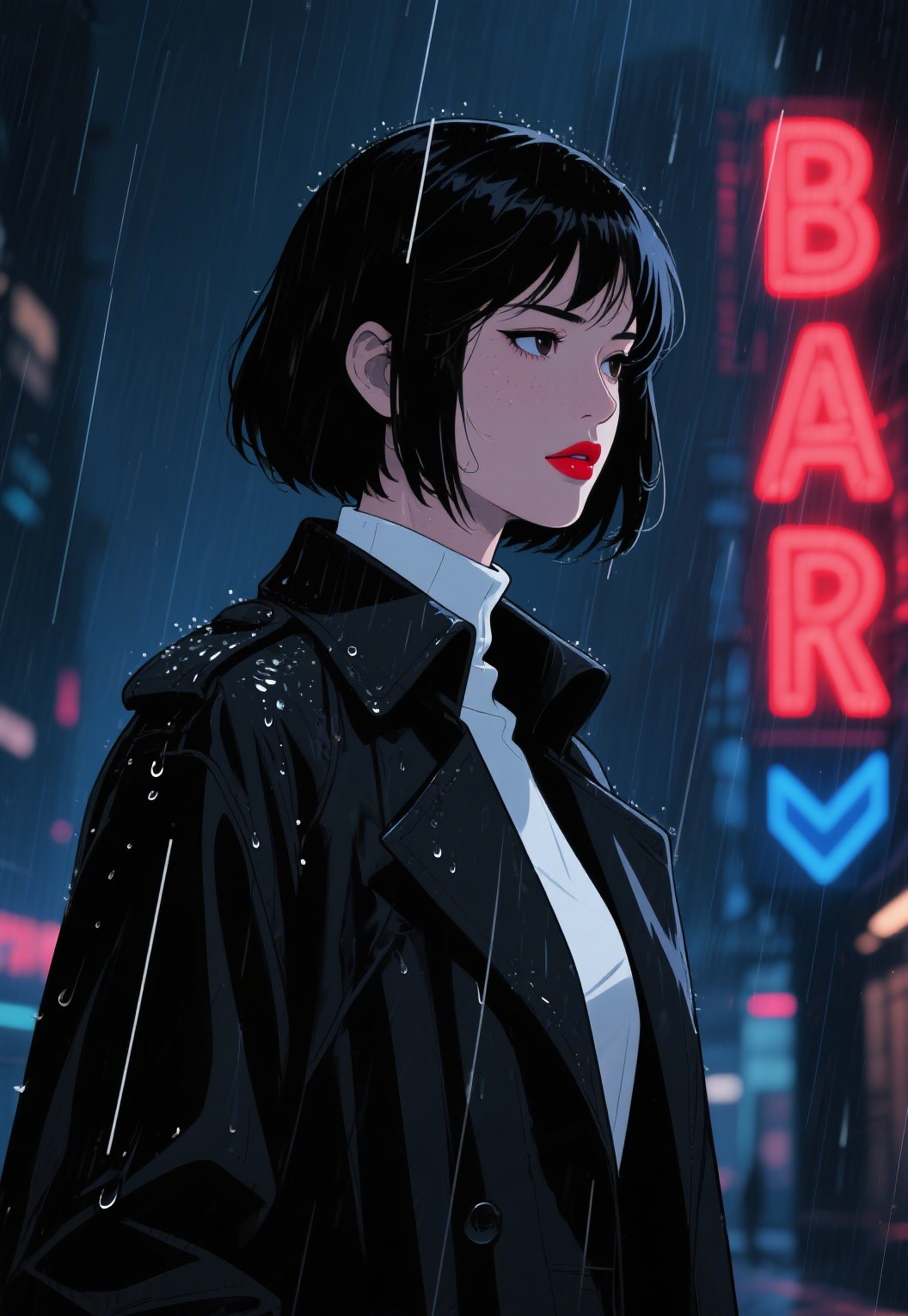 The image style is an 80s animated illustration, with a woman wearing a black trench coat, rain, profile, neon sign, high contrast shadows, ultra-high details, close-up of the face, in a ratio of 2:3