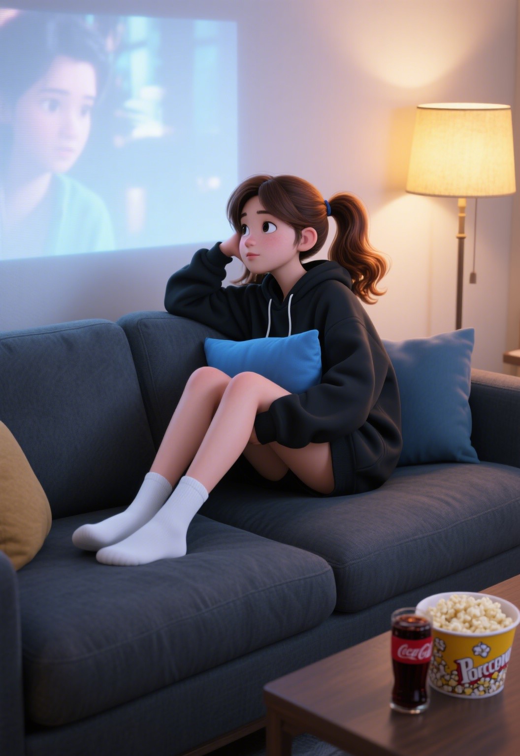 The image style is '3D rendering', with a girl in a double ponytail lounging on the sofa, watching a movie, wearing a large black outfit, with area lighting, and a ratio of '2:3'